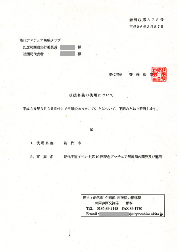 こうした中、JARL登録地域クラブである能代アマチュア無線クラブが能代市から特別局を運用することにより、交信等を通じて宇宙関連イベント及び能代市のPRを行うとともに宇宙科学の啓発メッセージを発信することは「宇宙のまち能代」を提唱する能代市への後押しとなりますし、地域住民、特にイベントに参加する若年層の方々の宇宙科学・無線技術への理解や興味も高まるものと考え、能代宇宙イベント主催者の開設同意及び能代市の後援をいただいて無線局免許の申請を行い、2014年5月15日付けで免許されたものです。